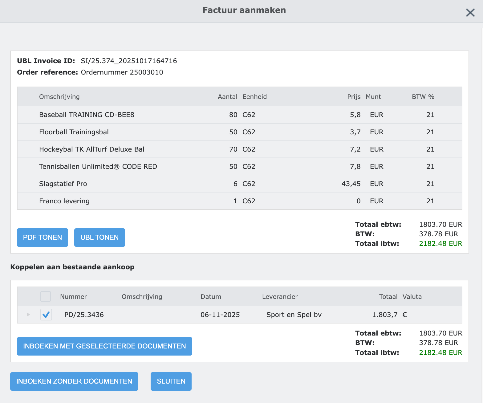 In het scherm dat u dan krijgt ziet u de gegevens van de ontvangen factuur. Daaronder kan u kiezen om de factuur te maken op basis van een aankoopbestelling / aankooplevering of om de factuur in te boeken zonder bijhorende documenten.